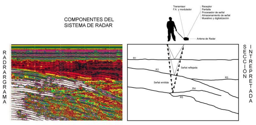 Se trata de un método no invasivo de análisis de materiales basado en la transmisión de ondas electromagnéticas de banda ultra ancha en los materiales; en el rango de 10 MHz a 2,6 GHz. Una parte de la onda electromagnética se refleja cuando se alcanza un límite entre dos materiales con diferentes propiedades eléctricas. La señal reflejada se graba y se muestra para el operador y con frecuencia registrada para su posterior análisis. Las aplicaciones más comunes son: estudios geológicos/geotécnicos a más de 80 m, detección de cavidades, prospección de agua subterránea, detección de fallas y fracturas.